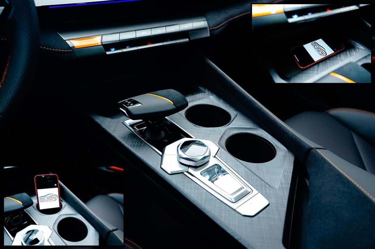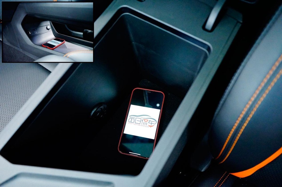 挡杆台采用大面积拉丝面板打底,搭配丰富镀铬元素和翻毛皮装饰,很有时尚感。居左布置的电子挡杆是轻薄的推杆造型,由仿皮和翻毛皮包裹,并增加黄色装饰,看起来绝不平淡。后方的旋钮和按键组合的形状也很有趣,包括“P”驻车挡、360°全景影像、一键紧急录制、电子手刹、自动驻车按键和驾驶模式切换旋钮。前方手机储物格够大也很开阔,除入门车型外均支持手机无线充电,右侧是两个独立杯架。