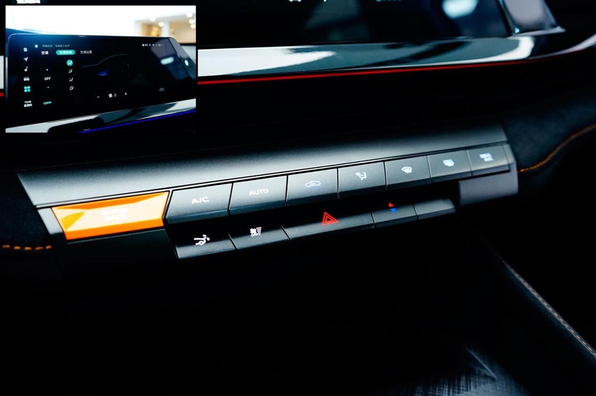 屏幕下方保留了实体按键区域,多数按键用来控制空调系统,大块橙色按键是赛道模式开启,下排左侧按键用来控制电动尾翼升降。