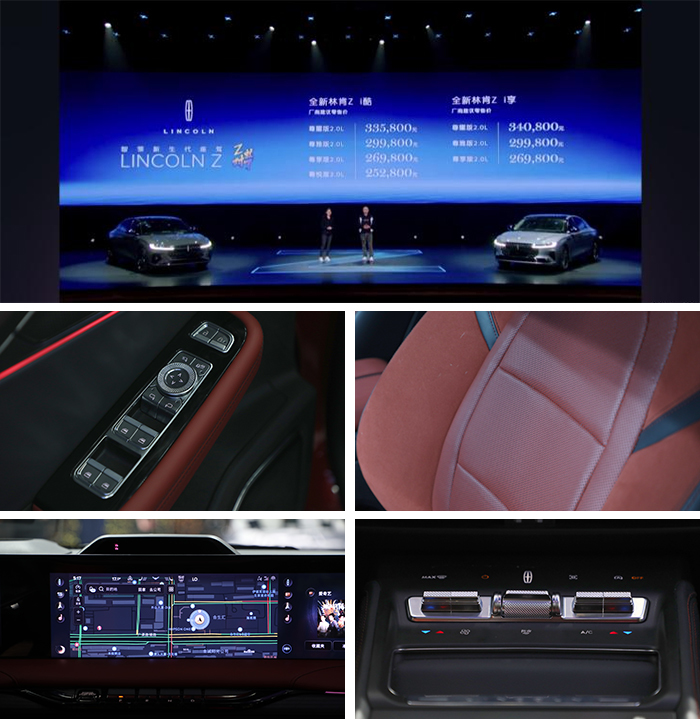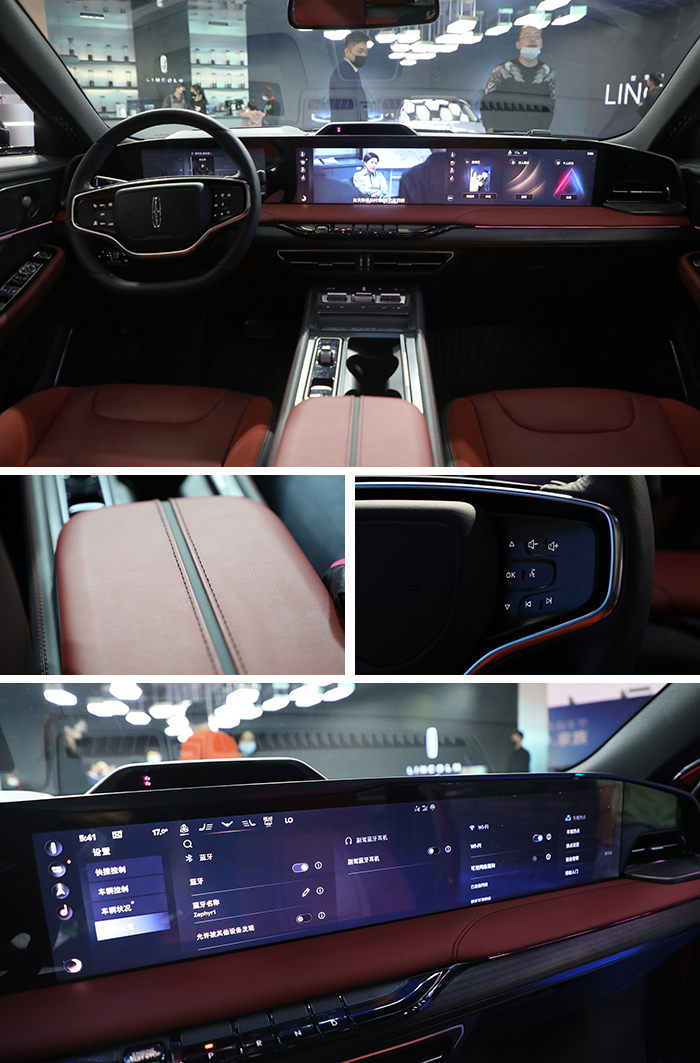 内饰方面,林肯Z保持了其品牌一贯的豪华典范,无论是用料还是做工都相当考究,甚至在座椅配色上也力求精益求精。贯穿式大屏应该是新车最大亮点之一,相比以往常见的贯穿大屏,林肯Z可谓一长到底,由12.3英寸全液晶仪表盘和27英寸中控大屏形成了包括副驾前方整片的显示界面,视觉冲击力爆棚,而且还是全系标配。除了配备像导航和影音娱乐等常用功能以外,还配备面部识别、128色氛围灯、香氛系统、方向盘加热和座椅按摩等诸多舒适豪华配置。