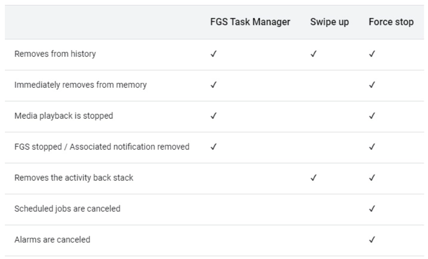从官方的参数表可以看到,FGS 任务管理器的停止等级处于“滑动关闭”和“强制关闭”之间,会清除内存占用、关闭音频服务、移除相关通知,但不会影响活动的 back stack 等。