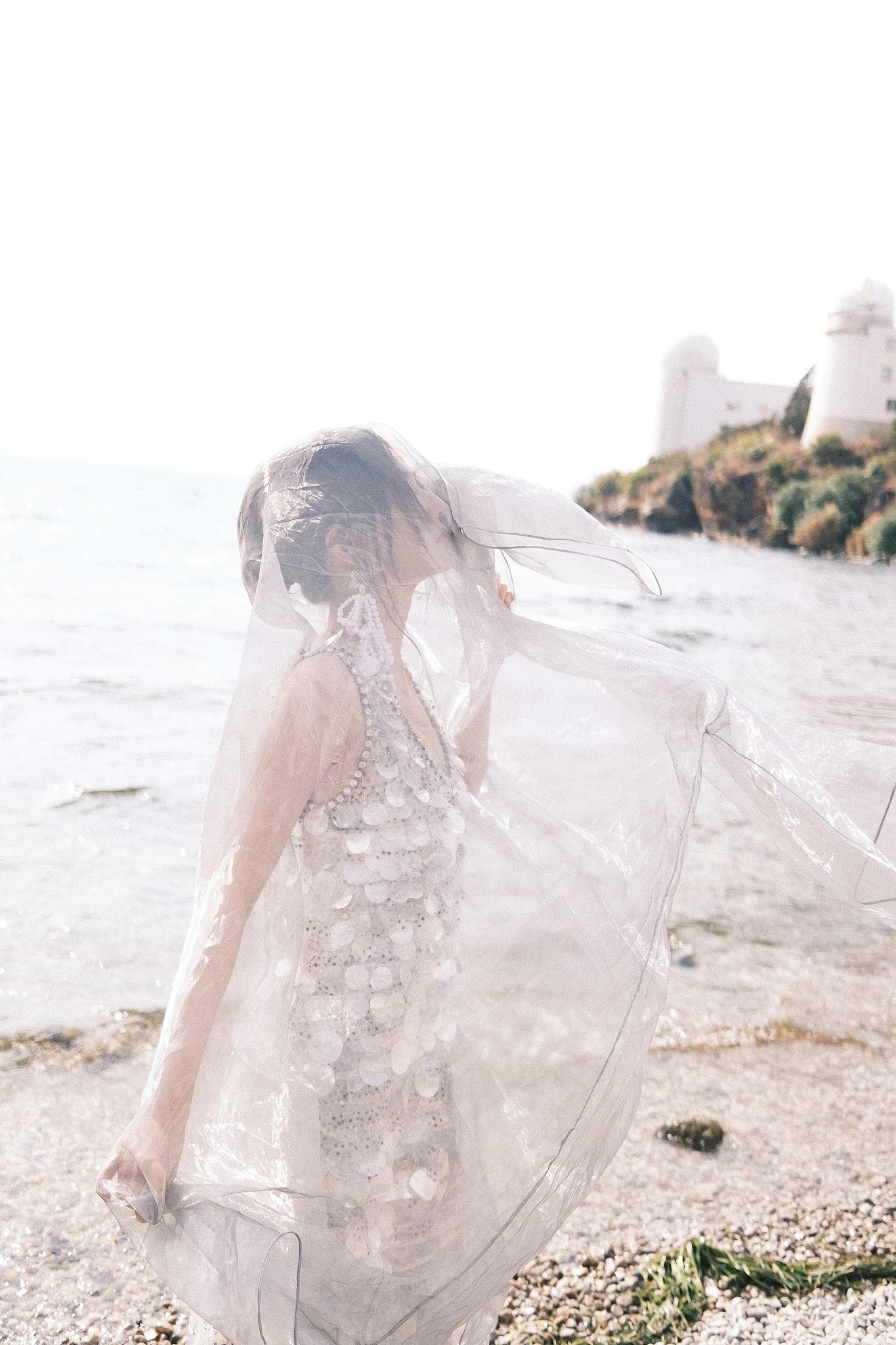 徐璐海边着银色亮片长裙似人鱼 白纱遮面营造朦胧氛围感