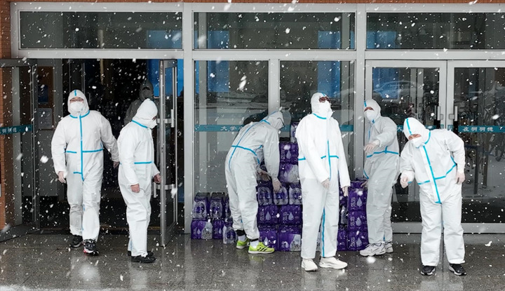 吉林大学志愿者正在为学生配送矿泉水。受访者供图