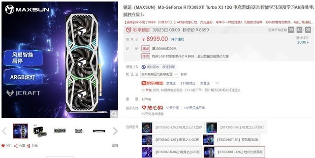 MAXSUN 铭瑄 MS-GeForce RTX 3080Ti Turbo X3 12G 独立显卡当前售价8999元,明日(23日)00:00秒杀价8699,叠加满1000元减300元活动,到手价仅需8399元,虽然售价不低,但性能强悍,轻松应对3A大作,性价比非常不错,有需要的小伙伴儿可以关注一下。
