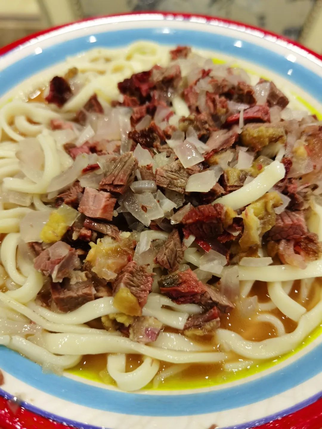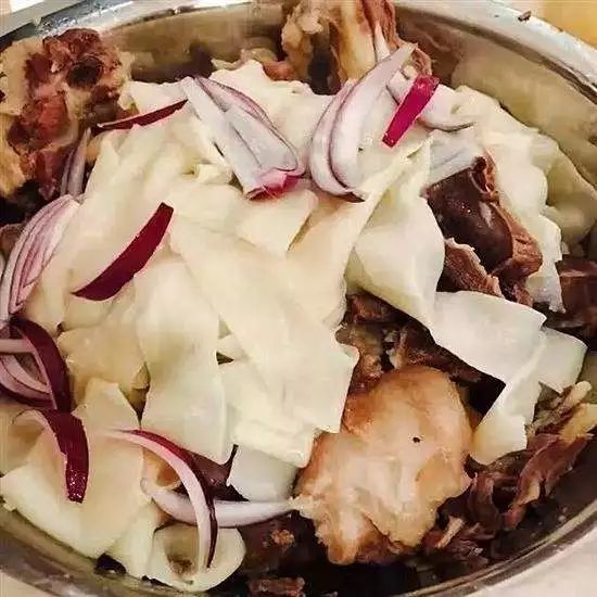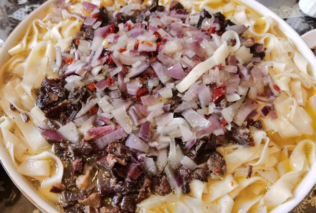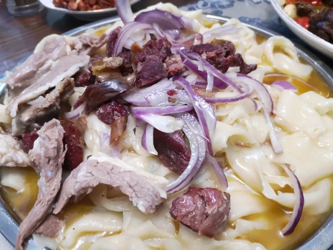 纳仁新疆美食,通常用羊肉、马肉、牛肉烹煮而成,是哈萨克、柯尔克孜等民族的风味食品。在伊犁马肉比较出名,今天就介绍一下伊宁美食——马肉納仁。纳仁是面食,一般手擀出来的宽皮带面做的纳仁入味最佳。将煮熟的纳仁面放入盘中,纳仁面表面撒一层洋葱,将切好熟马肉均匀在盘中摆好。将沸腾的马肉汤浇在肉面上。连同煮熟的马肉一起享用,一块马肉或者马肠,搭配面一并入口,那味道鲜香无比。