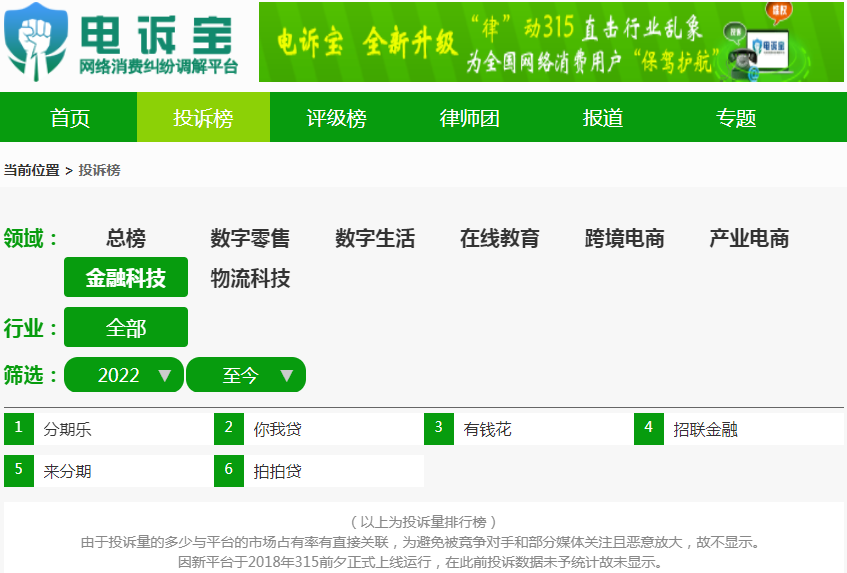 2022年至今同样被投诉的金融科技领域平台还有:你我贷、有钱花、招联金融、来分期、拍拍贷。