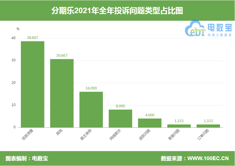 此外,国内网络消费调解平台“电诉宝”受理用户维权案例显示,“分期乐”2021年全年主要集中在还涉嫌存在信息泄露、霸王条款、网络欺诈、退款问题、客服问题、订单问题等问题。