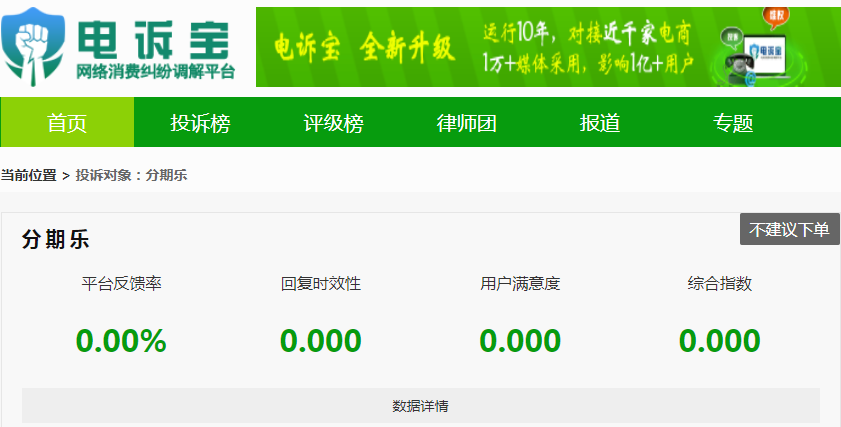 根据“电诉宝”受理的金融科技领域用户有效投诉显示(依据投诉量排行),分期乐排名第1位。最新评级为“不建议下单”。