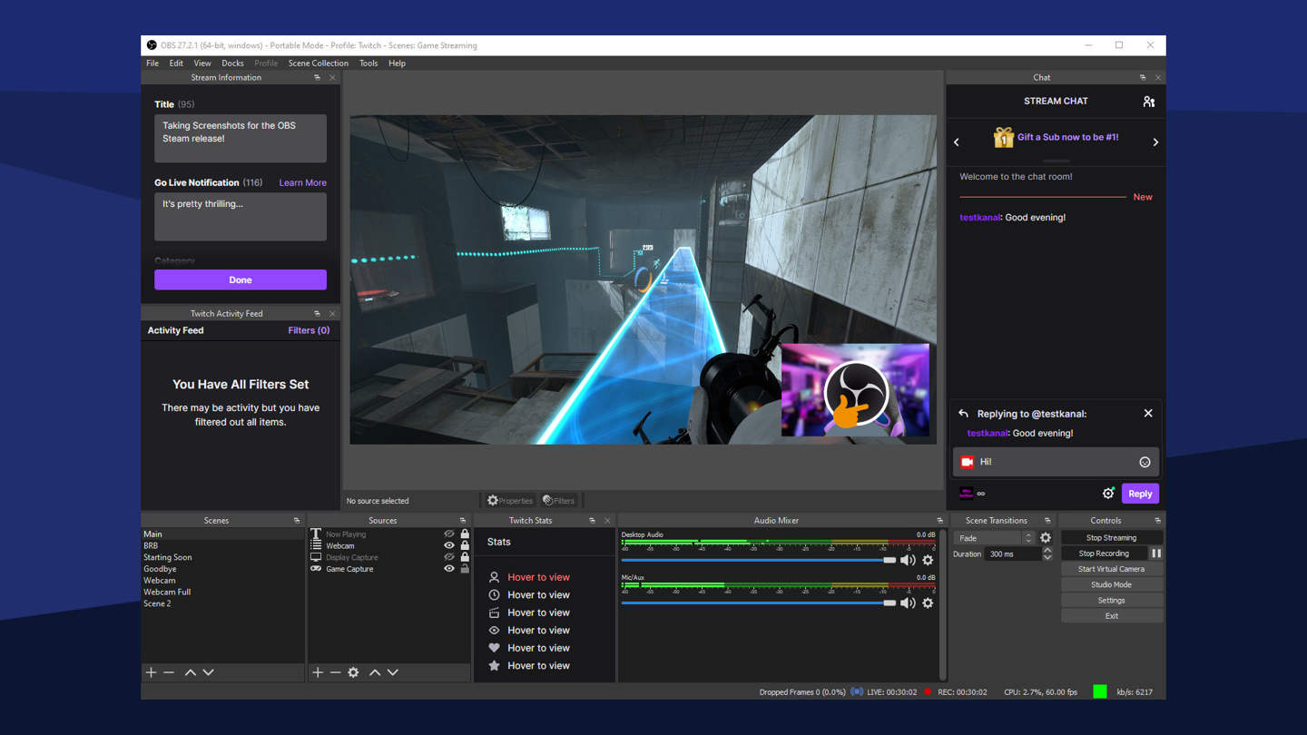 目前,Steam 版本的 OBS Studio 已推出 27.2 版本更新,支持简体中文。OBS Studio 在直播行业很受欢迎,可用于直播和视频录制。用户可使用多种类型的视频源创建场景,包括计算机显示器、视频游戏、网络摄像头、视频文件等。