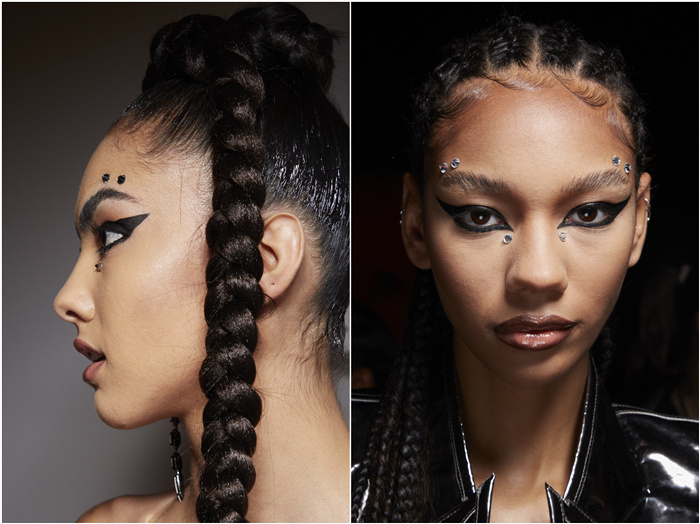 这一季2022秋冬纽约时装周:The Blonds妆容里就运用了麻花辫与大面积眼线+铆钉亮钻妆容搭配,用简单利落的发型突显妆容point。