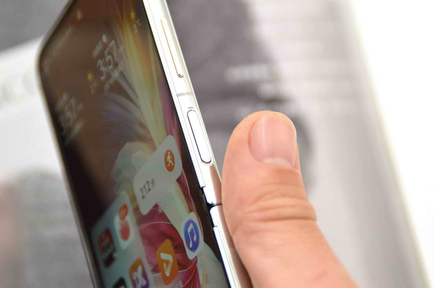 机身右侧上方是音量±键和电源键,音量键略比常见的机型短些,但不影响音量增减的操控,电源键集成了指纹识别功能,周边内凹的造型,更利于盲触,因为当下的指纹识别技术相当成熟,所以,华为的这个指纹识别准确率和效率都非常高,整体上,你会发现音量±键和电源键的位置都会略微靠上,首次使用时需要适应一下,其实这种略微靠上的位置布局,是兼顾了展开和折叠后的触按操控,无论是否折叠,都能给用户带来一个比较舒适的触按位置。