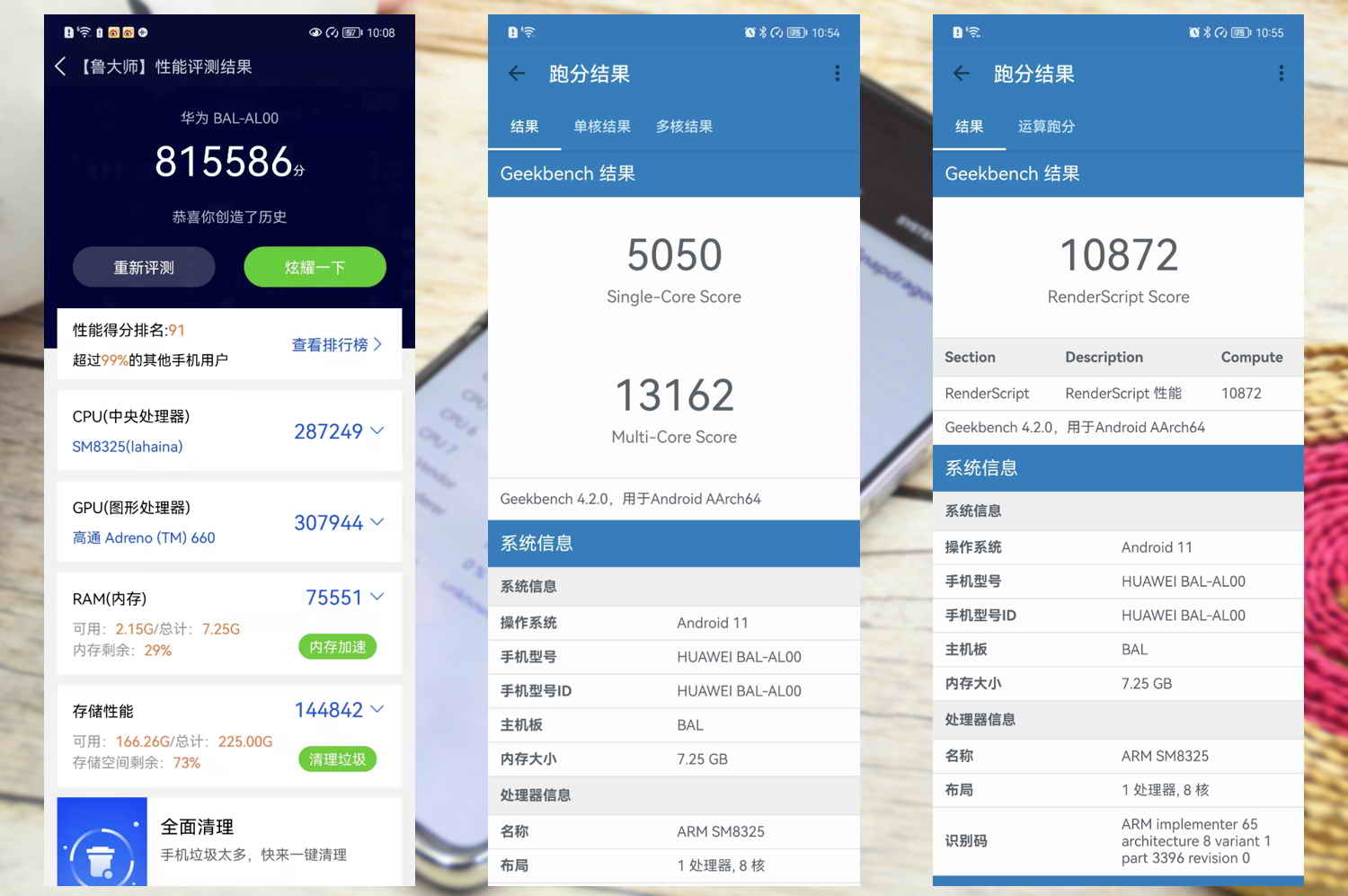 在各大跑分应用中,华为P50 Pocket都获得了不俗的成绩,其中在鲁大师中跑出81万分,超过99%的其它手机用户,在Geekbench的单核成绩5050分,多核得分12162分,运算跑分10872分,3Dmark中的Wild Life得分5584分,Wild Life Extreme得分1405分,AI Bench得分21万分,在各个跑分测试中,华为P50 Pocket都有着相当不错的成绩。