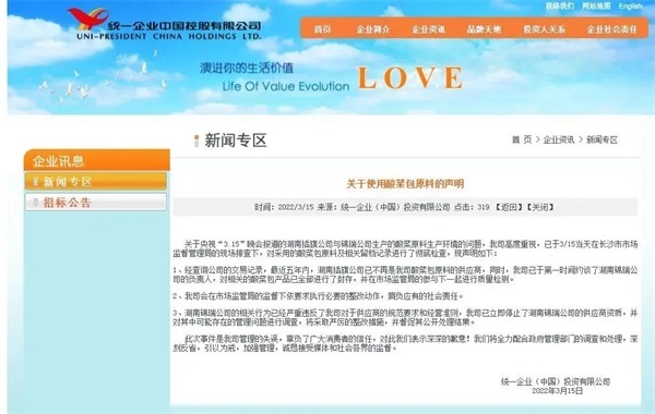 统一企业(中国)投资有限公司当晚在官网回应称,已于3月15日当天在长沙市市场监督管理局的现场排查下,对采用的酸菜包原料及相关留档记录进行了彻底检查。