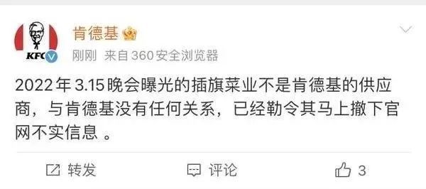 百胜中国则对中新财经表示,插旗菜业不是肯德基的供应商,与肯德基没有任何关系,已经勒令其马上撤下官网不实信息。
