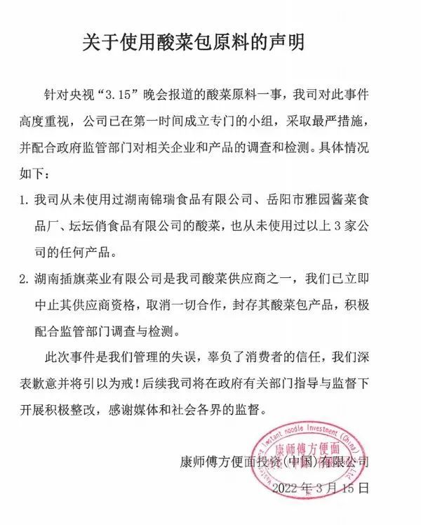 16日凌晨,康师傅方便面投资(中国)有限公司发布声明称:湖南插旗菜业有限公司是我司酸菜供应商之一,已立即中止其供应商资格,取消一切合作,封存其酸菜包产品,积极配合监管部门调查与检测。