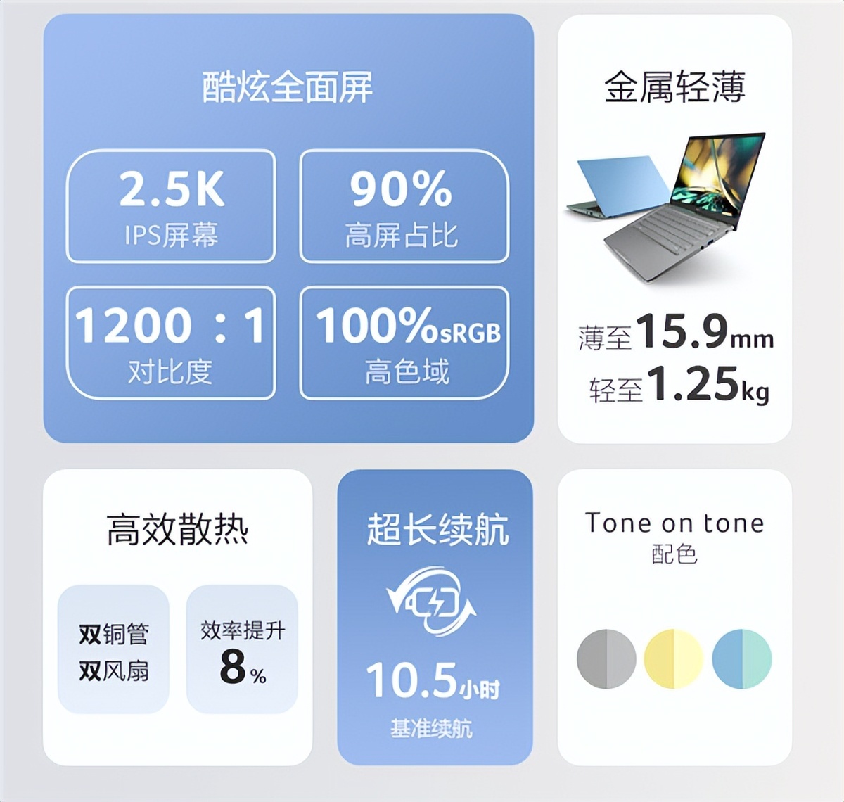 同时延续潮流设计,钻切边线的铝合金机身,薄至15.9mm,轻至1.25kg,搭配黄、蓝、银多彩的潮流配色,时刻彰显年轻活力。