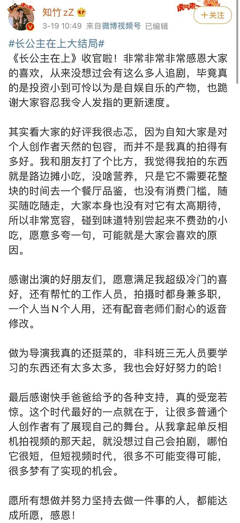 大结局当天,长期被粉丝催更的的导演兼摄像@知竹zZ专程发布了一条微博,她先是感谢了粉丝对这部“投资小到可怜到以为是自娱自乐的产物”的大力支持,然后又向那些“身兼多职的工作人员及好朋友们”表示了真诚的谢意,最后则是对给予了各种支持的快手平台诉说了自己的感激之情。