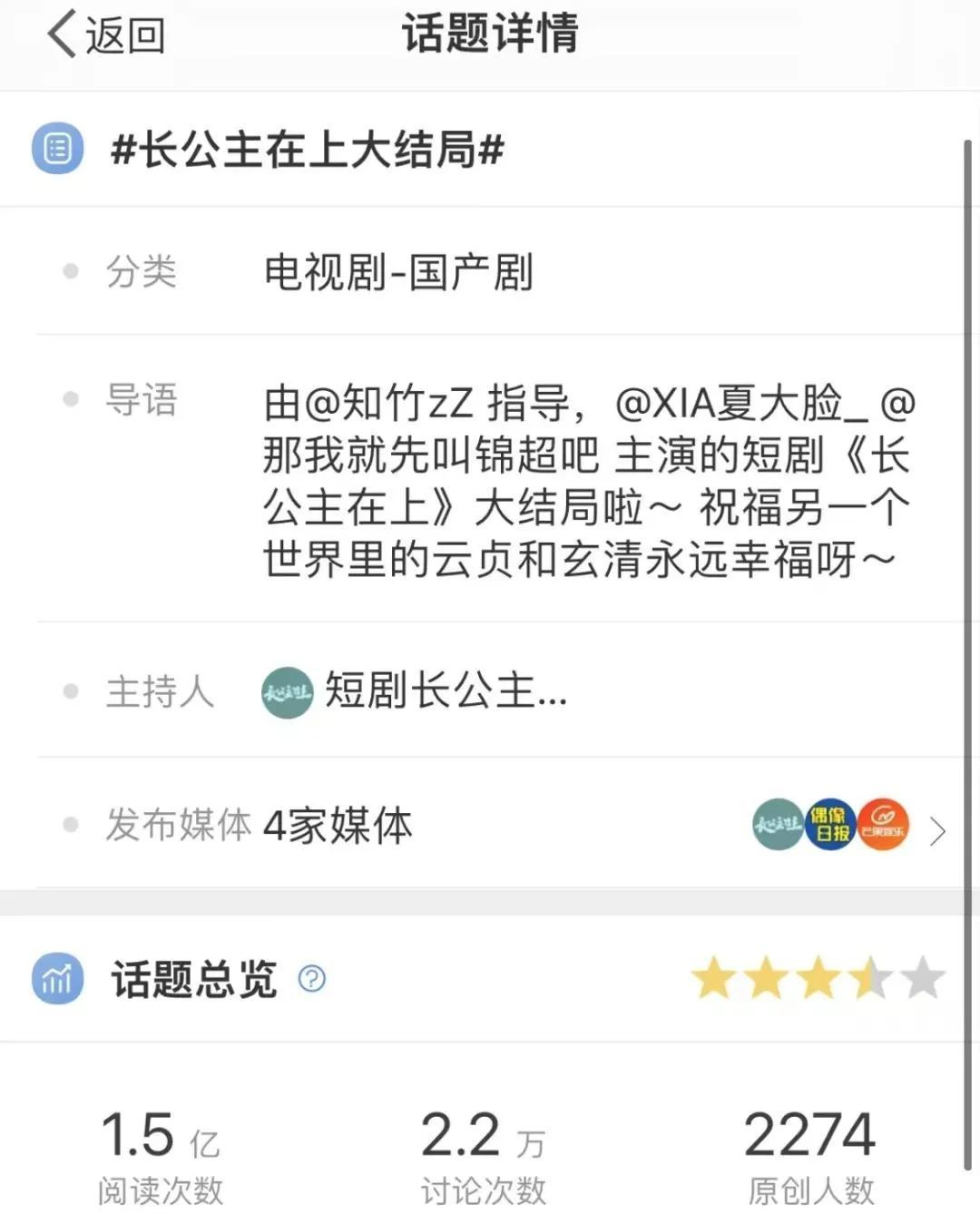 3月19日,短剧《长公主在上》迎来大结局。随即,话题#长公主在上大结局#冲上微博热搜,目前阅读次数已达1.5亿。