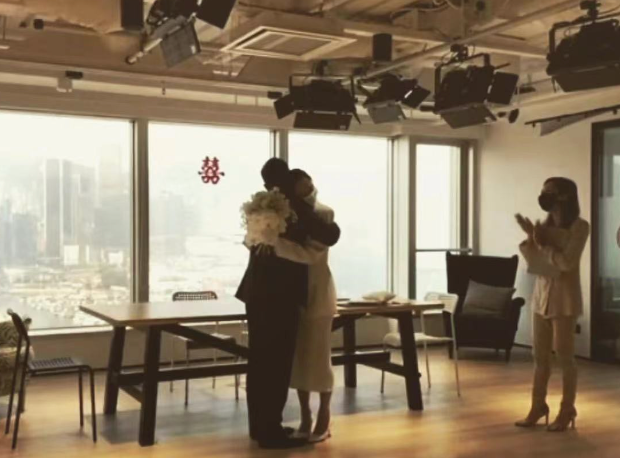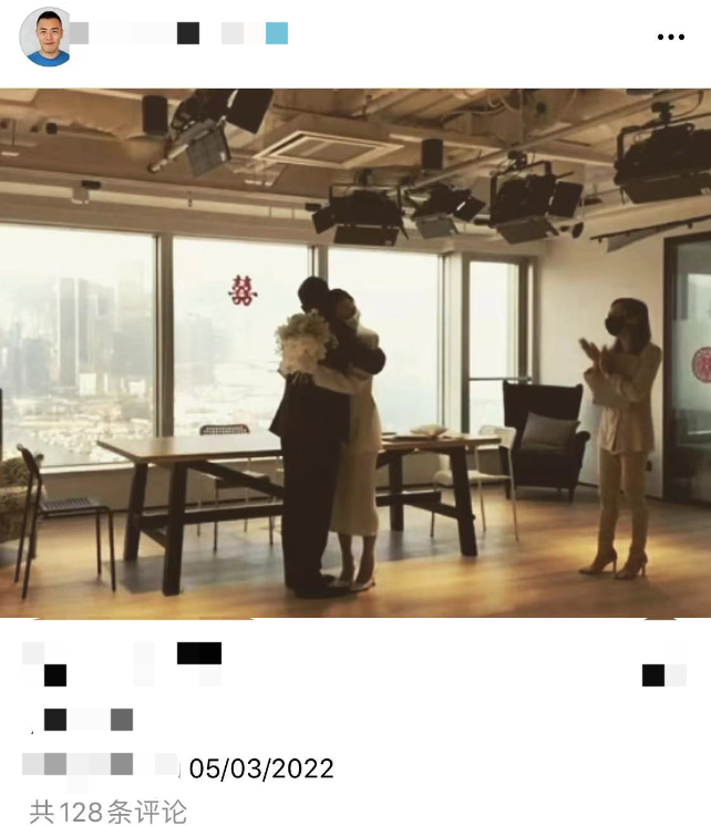 根据刘鸣炜分享的照片显示,刘鸣炜穿着黑色西装与一位女子相拥在一起,旁边带着口罩的人还在鼓掌,看起来场面十分感动。这名穿着白色长裙的女子手握着一束鲜花,轻轻靠在刘鸣炜的肩上看起来很是幸福。
