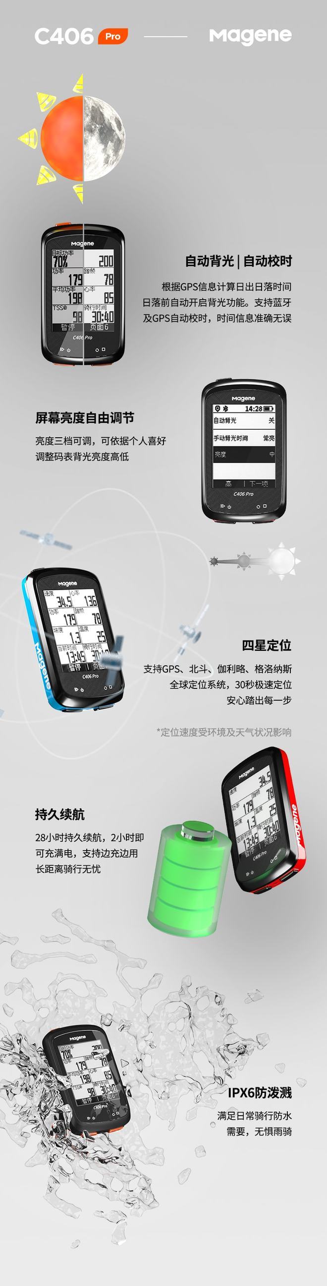 在其他功能方面,C406 Pro码表支持GPS/北斗/伽利略/格洛纳斯四星全球定位系统,在天气晴朗的情况下可实现 30 秒极速定位;长达28小时的续航时长,长途骑行时也可边充电边使用;支持自动校时与自动背光功能,屏幕亮度3档可调,您可依据个人喜好调整码表背光亮度高低;IPX6级别防水,满足日常防水需求。