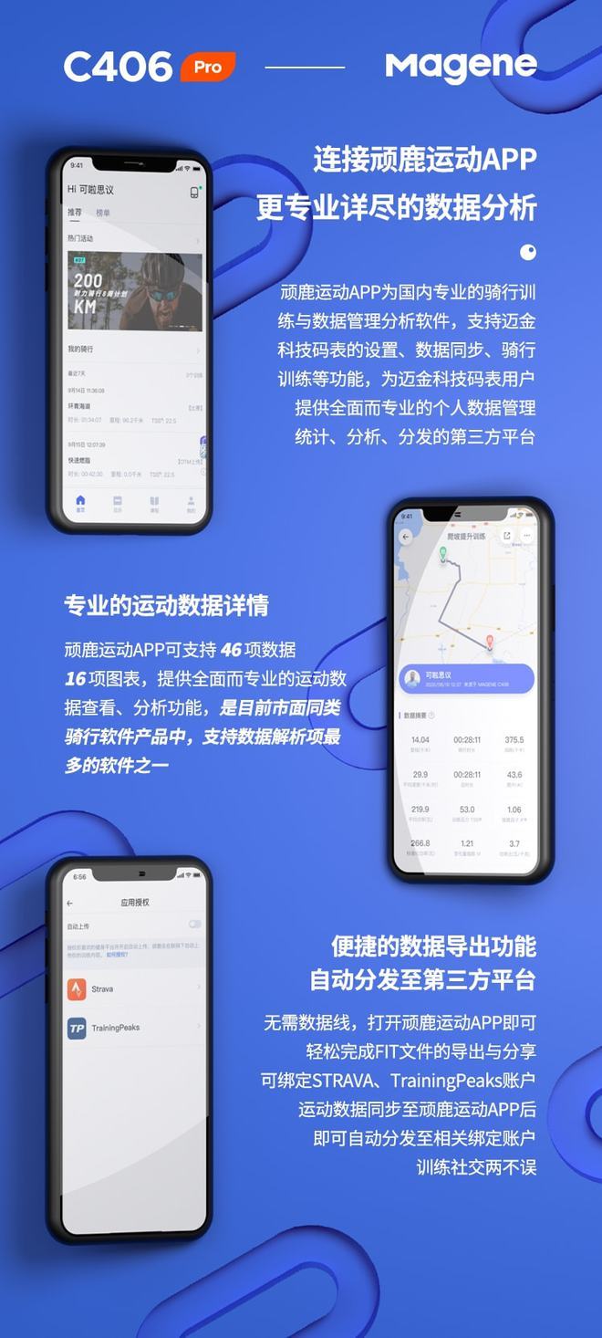 同时C406 Pro码表支持绑定STRAVA、TrainingPeaks账户,数据同步到顽鹿运动APP后,将自动分发至至相关绑定账户,训练社交两不误。