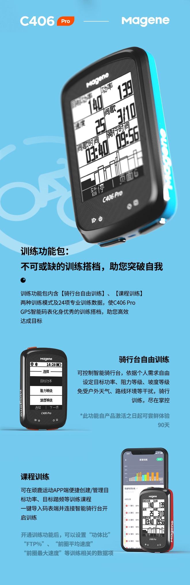 与您的智能骑行台配对后,科学骑行训练,只需一块C406 Pro码表便可轻松搞定。