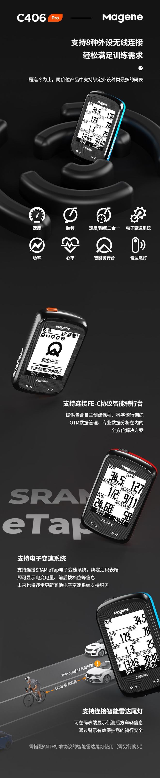 C406 Pro码表可兼容ANT+、蓝牙双协议,支持速度、踏频、速度/踏频二合一、功率、心率、智能骑行台、电子变速系统、智能雷达尾灯共8类传感器外设连接,是迄今为止,同价位产品中支持绑定外设种类最多的码表。