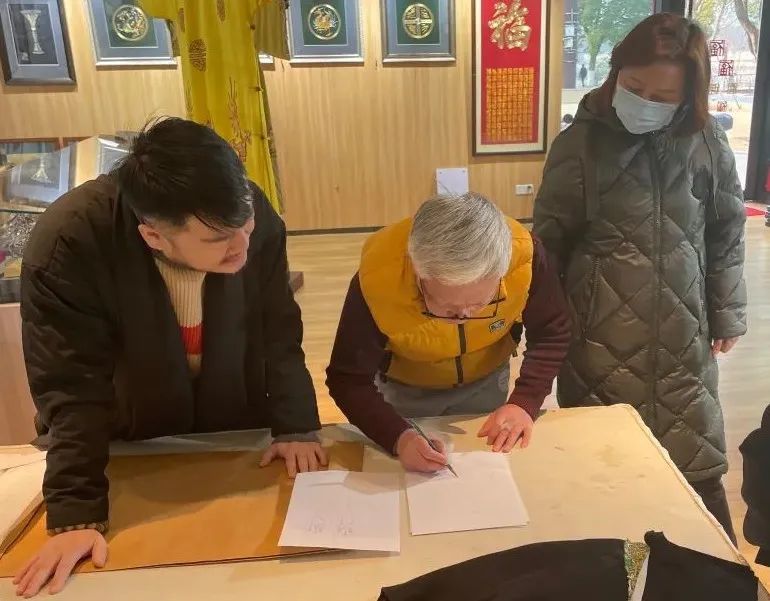 设计师胡社光与两位非遗传承人共同商定汉绣图样