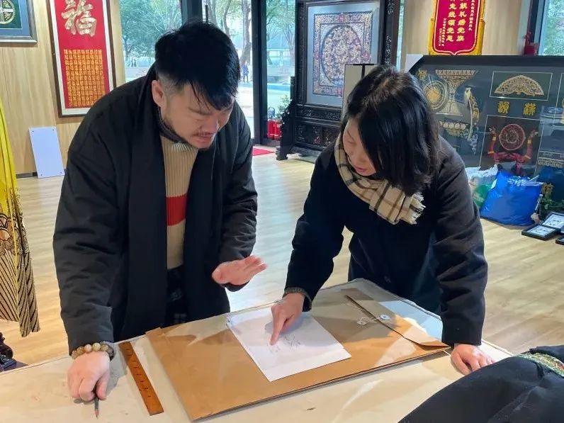 非遗中心沈主任与设计师胡社光共同探讨汉绣的呈现方式