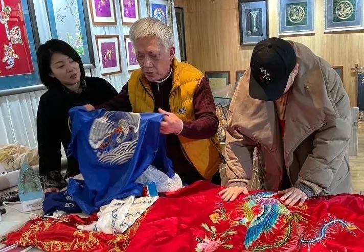非遗中心沈主任(左)、汉绣非遗传承人姜老师(中)、设计师胡社光(右)