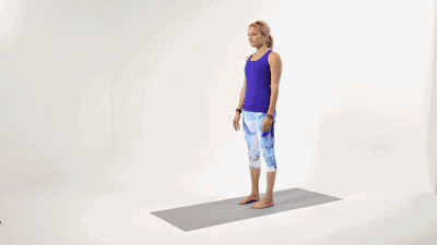 站立,左脚踝放在膝盖上方,脚回勾;双手向上延展,弯曲右膝盖