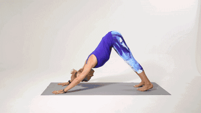从下犬开始,右脚往前,弯曲膝盖,膝盖对齐脚踝