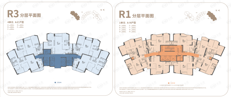 R3为34F住宅塔楼,住宅楼层从9F开始,户型面积153-178㎡,西北朝向——E户型175㎡、A户型178㎡;东南朝向——D户型153㎡、B户型154㎡、C户型166㎡。层高3.4米,3梯5户。