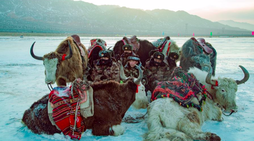 这是正在热映的电影《花儿为什么这样红》中的片段。影片讲述了拉齐尼接过祖父、父亲巡边卫国的牦牛鞭,在边防一线几十年如一日地守卫国土的感人故事,并再现了他冰湖救人最终牺牲的英雄壮举。