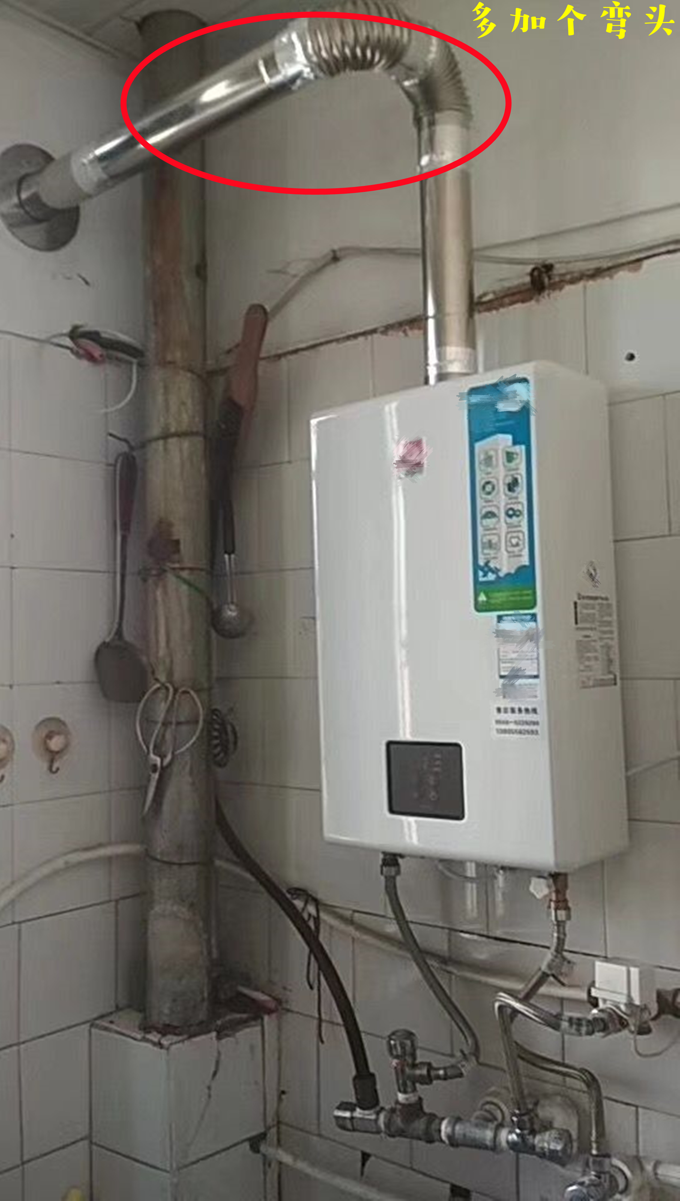 ②或者干脆就给排烟管多加个弯头,位置离燃气管远一点,这样排出去会更好些。