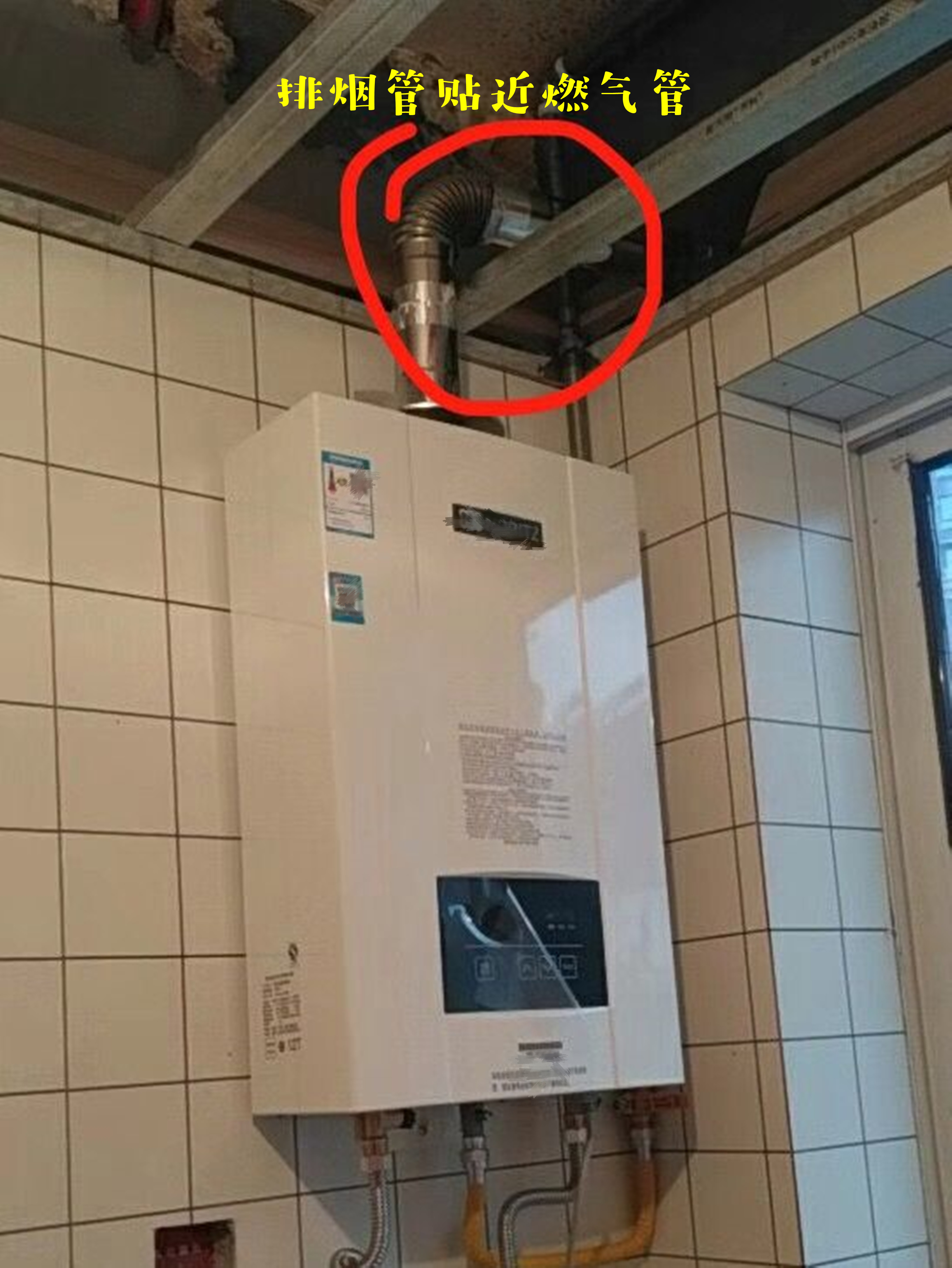 网友提问:这几天把燃气热水器装上了,只不过出现了一个问题:热水器的排烟管与燃气管距离这也太近了吧!大概只有1cm,贴得这么近真的可行吗?感觉很不安全啊!
