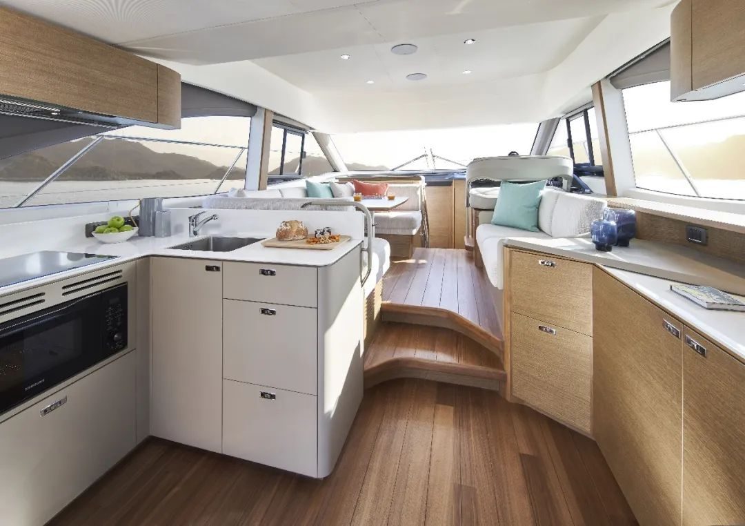 带储物功能的船尾沙发也是Bali 4.2极巧妙的空间设计特点之一,船尾可选装柚木游泳平台、柚木登船台阶,实用奢华。Bali 4.2保留了设计巧妙的大型可完全折叠收起的客厅翻折门,厨房前部的可开启大窗也非常方便客厅与船首的沟通互动。几乎每个生活区都面朝大海,全开放式的海景空间更是难以比拟。