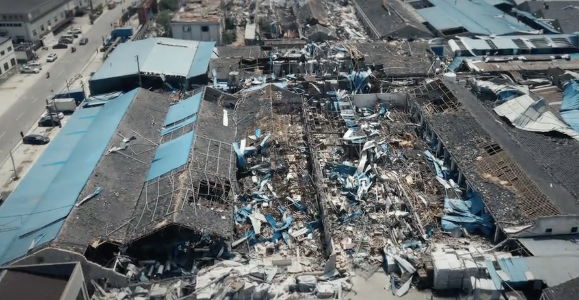 2021年5月14日,龙卷风突袭江苏省苏州市吴江区盛泽镇,造成房屋倒塌。追风视频截图