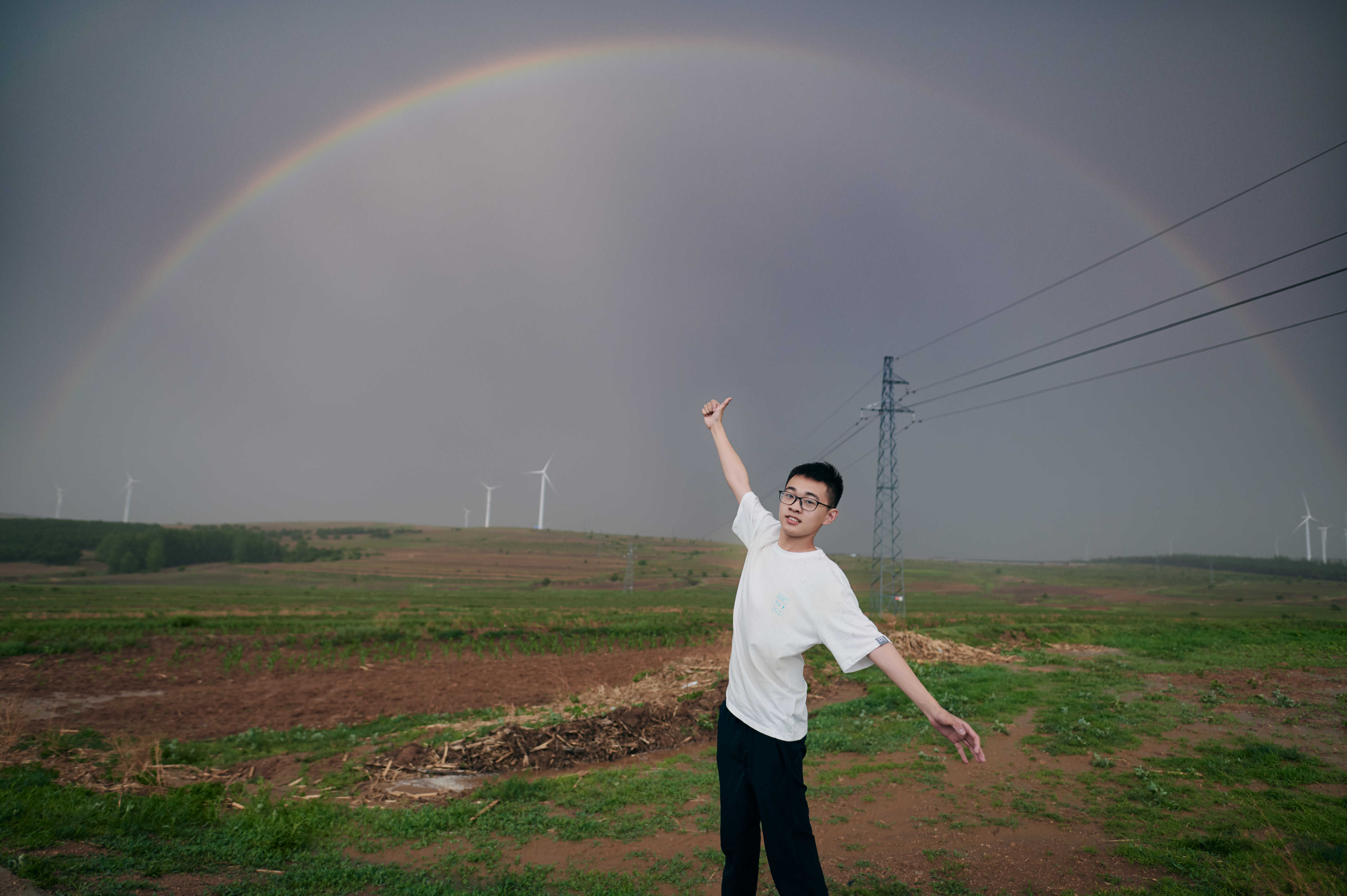2021年8月,苏镝坷在内蒙古通辽看到了风暴过后最美的彩虹。那是一次强对流天气,云墙压下来,周围一片漆黑,他们仿佛被吞进了风暴里,只能用大声喊叫来对抗恐惧。20分钟后,乌云散去,雨声渐停,两道彩虹悬在原野之上。