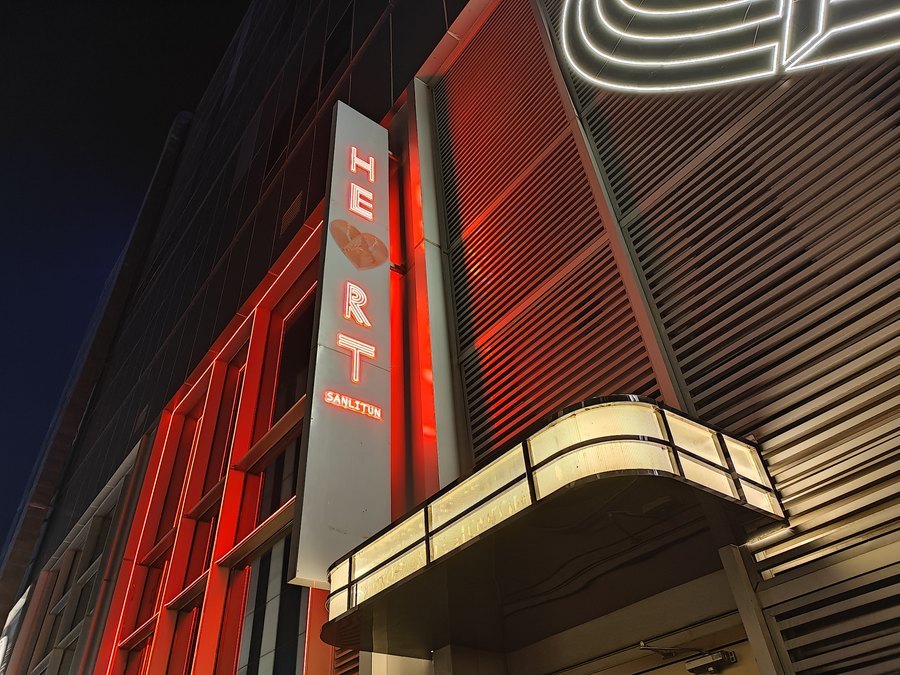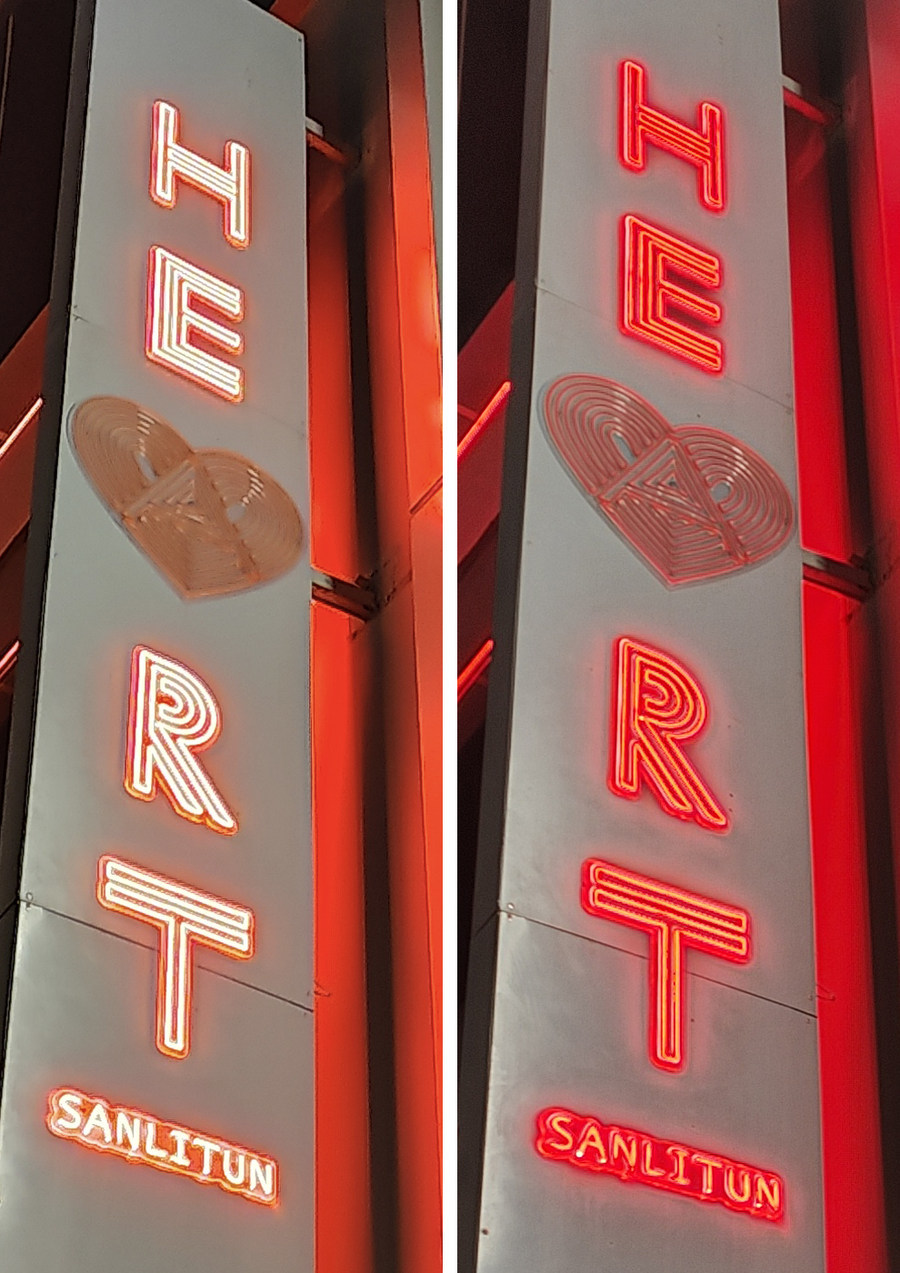 使用过手机夜景模式的朋友应该都知道,高亮光线的红色对于夜景拍照非常的不友好,一方面很容易偏色不能还原出真实的红色,另外也很容易丢失颜色区域的细节。从以上两款手机夜景照片的局部对比图可以看到,在同样的光线条件下,OPPO Find X5 Pro就很好地还原出了招牌上红色霓虹灯管的颜色与质感,这也和肉眼所见到的效果一样;而另一款手机拍摄的照片的红色则直接丢失,仅在外围稍微出现红色光线。