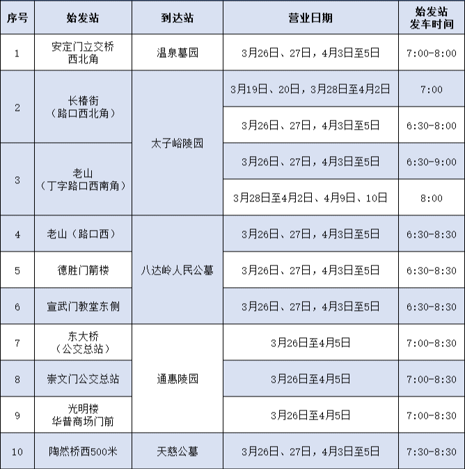 为方便市民到墓地陵园进行现场祭扫活动,2022年清明节期间,公交集团将开通10条由市区直达5处陵园墓地的清明扫墓专线,其中长椿街开往太子峪陵园的清明扫墓专线已于3月19日(上周六)开通,其他9条专线将于明日起开通运营。