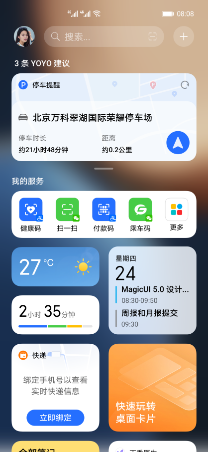 驾驶出行体验上,通过与高德地图、百度地图等合作伙伴产品能力的结合,荣耀YOYO建议还为车主带来主动导航、停车提醒等体验。只要连接汽车蓝牙,每次停车熄火后,荣耀手机会自动在负一屏的荣耀YOYO建议区生成停车提醒卡片,卡片上除了记录停车位置信息,还会实时显示停车时长、当前位置与停车点之间的距离等信息。如果方向感不好或者不熟悉周边路况环境,可直接调用系统地图,自动载入当前位置信息和目标位置信息进行导航,专治“小迷糊”。