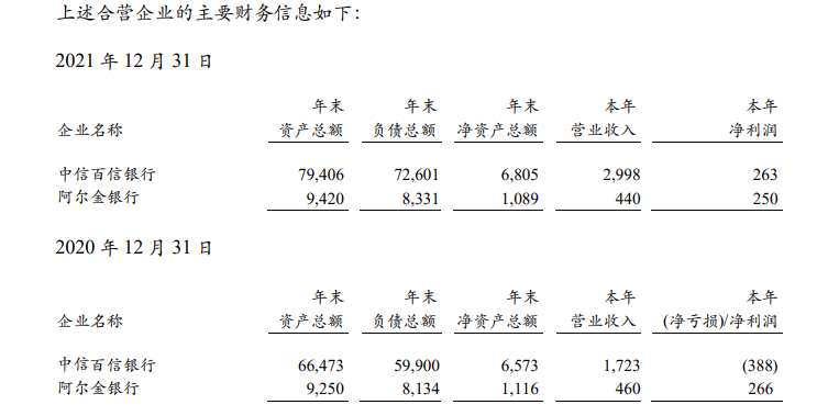 继2020年净亏损3.88亿元后,2021年中信百信银行股份有限公司(下称“百信银行”)实现扭亏为盈。大股东中信银行刚刚披露的2021年业绩报告显示,百信银行报告期内实现净利润2.63亿元。