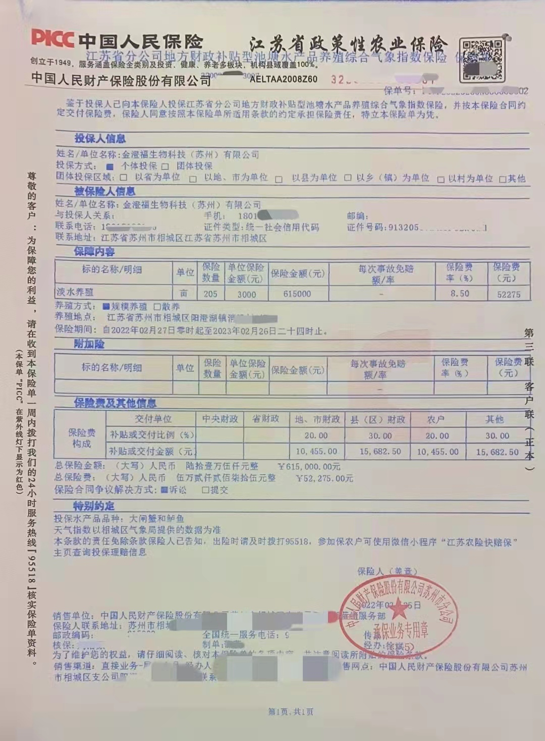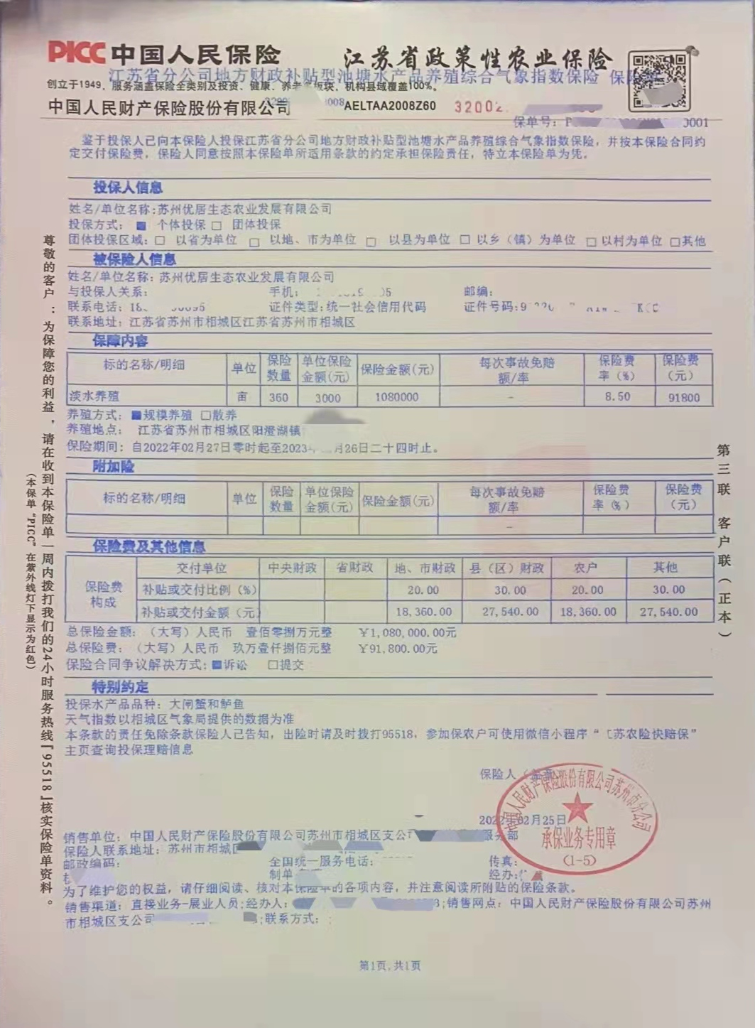 据了解,此次企业参保的产品为“地方财政补贴型池塘水产品养殖综合气象指数保险”,是一项政策性农业保险。 目前,苏州人保财险已在工商银行开通了农业保险对公数字人民币钱包,企业只要开通数字人民币对公钱包,农户个人开通数字人民币个人钱包,就可以使用数字人民币付款。