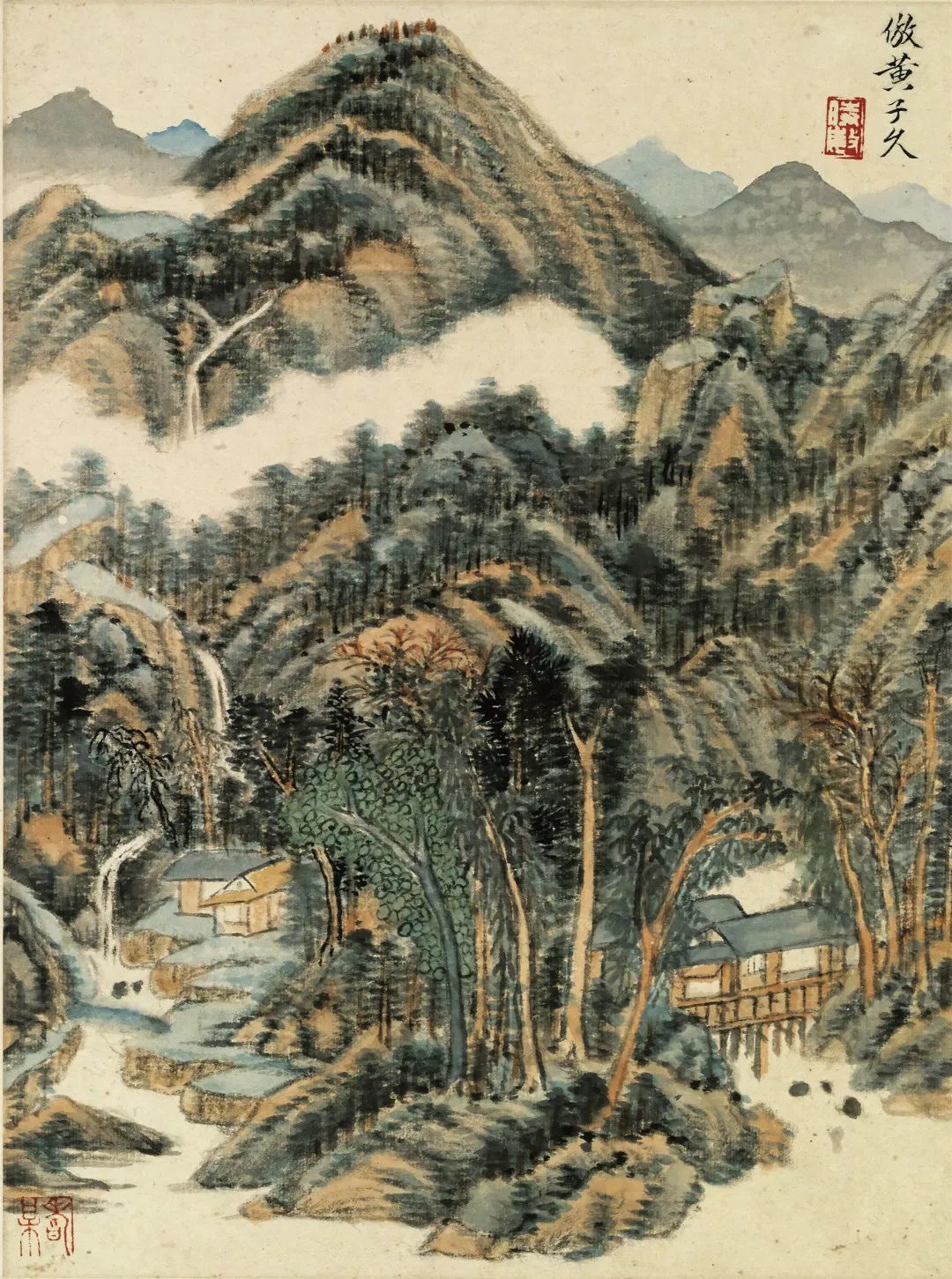 第九页,款署:“倣黄子久”,钤白文印“时敏”,压角章朱文“嗜梅”。此图虽云仿黄公望,实是得其“峰峦浑厚,草木华滋”之气象,设色浓厚,用墨沉郁,已是融合各家之法,自成面目。