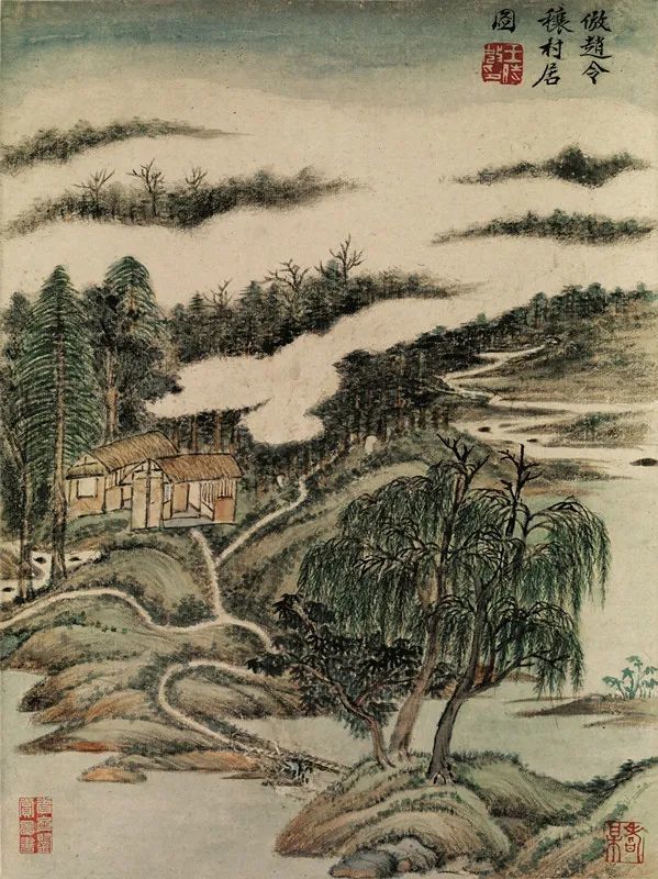 第六页,款题:“倣赵令穰村居图”,钤白文印“王时敏”,王时敏此图法赵令穰《湖庄清夏图》(现藏美国波士顿艺术博物馆)。董其昌、王时敏曾先后收藏《湖庄清夏图》于家中,即他们所说的《湖乡清夏图》。董其昌曾多次题跋于此卷,有一跋云:“此卷为王越石以倪迂设色山水易去,尤恐越石新都多收藏家,转入素封手,不韵。今又为逊之玺卿所得,得所归矣。”王时敏在《题王石谷仿赵大年画》中亦云:“余家藏赵大年《湖乡清夏图》,柳汀竹屿,茅舍渔舟,种种天趣,非南渡后人可及。”赵令穰的画多描绘郊野坡湖林越景色,水色烟光,富有诗意,在宋代山水画中另具一格。王时敏此图湖舍临岸,垂柳拂溪,路径深远,远处林渚笼罩在烟霭下,显隐明灭,富有润泽迷濛之感。幽静的居所,葱郁的山川,清润的空气,深渊的旷野,组成了一幅若梦若诗的画卷。