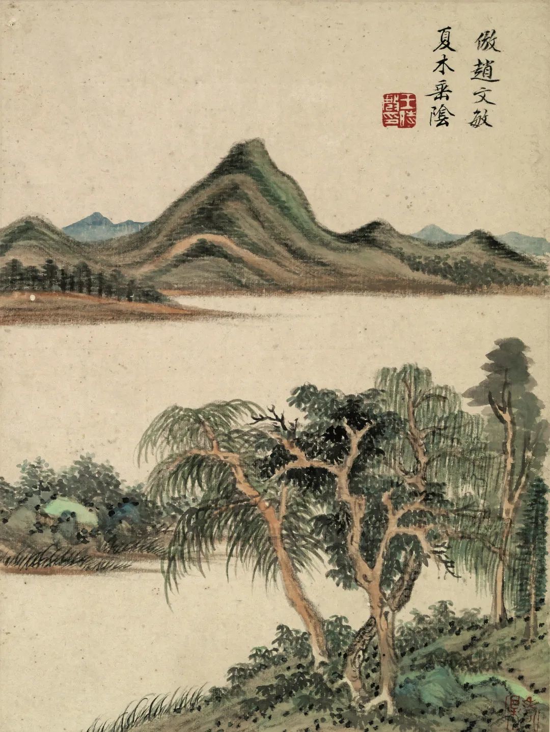 第四页,款落:“倣赵文敏夏木垂阴”,钤白文印“王时敏”。赵孟頫的山水都写江南平远开阔之景,山石用董源“披麻皴”画出,用笔松秀含蓄,渴笔为多,线条有书法的书写性。他的作品借景抒情,画面悠然静穆,体现出作者对“平淡天真”的审美追求。赵孟頫的画有高逸的士大夫气息与散逸的文人气息,是以诗意化、书法化来抒发隐逸之情的逸格文人画,开创了元明清文人画的新格局,影响深远。赵孟頫的青绿山水画合唐人青绿重彩与宋人笔墨,另具新格,古朴中见秀雅。王时敏此画树石、陂陀行笔凝重,勾皴、破染并用,笔线劲健,似篆籀用笔,工谨中又有隽秀之姿。设色浓丽,青绿重色中兼施赭石、水墨,浓丽中不失清雅之气。王奉常此图深得赵文敏精逸技法与文人雅韵相结合之奥。