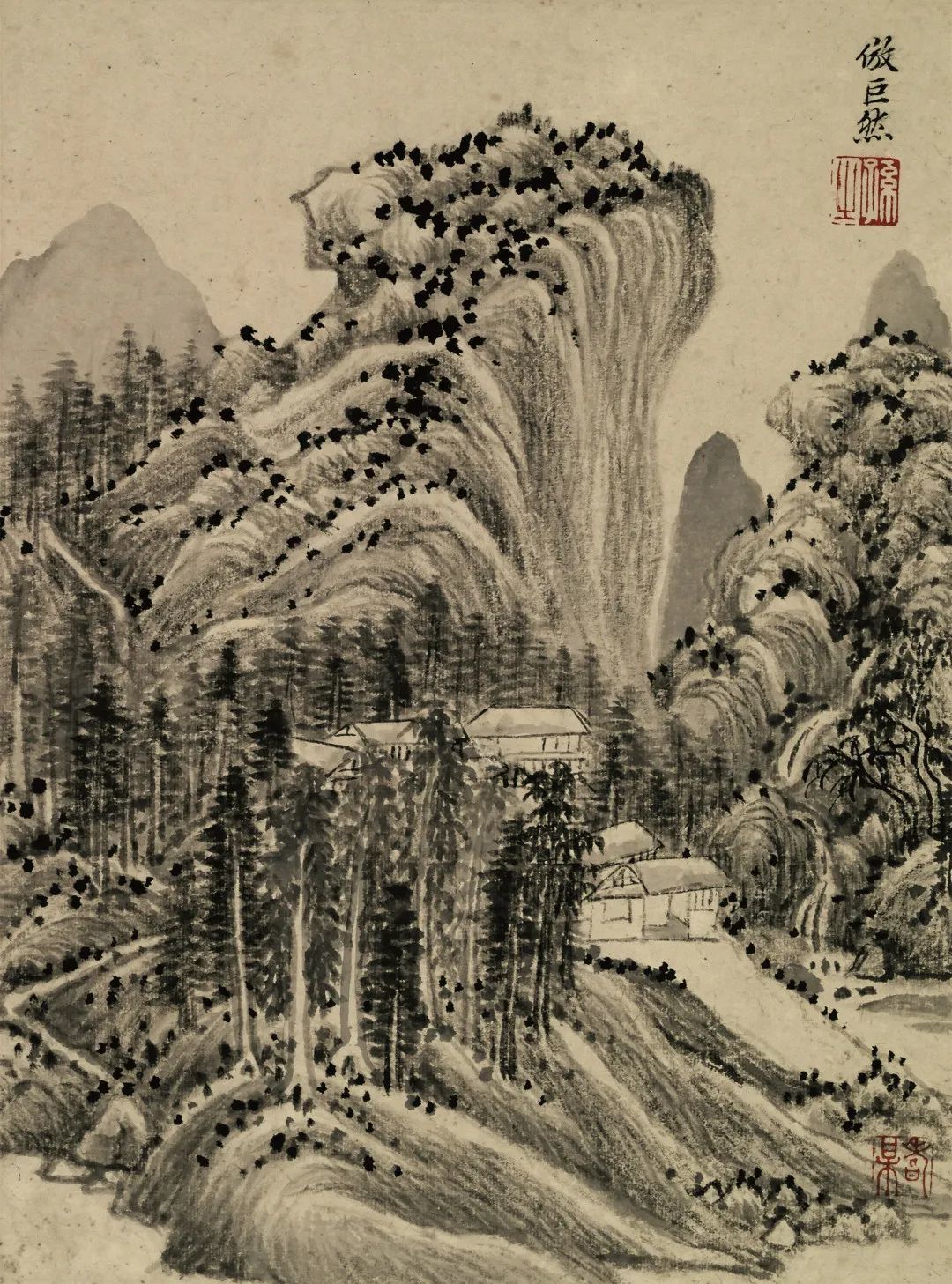 第七页,款署:“倣巨然”,钤白文印“逊之”。《宣和书画谱》载:“巨然山水于峰峦岭窦之外,下至林麓之间,犹作卵石、松柏、疏筠、蔓草之类,相与映发,而幽溪细路,屈曲萦带。竹篱茅舍,断桥危栈,真若山间景趣也。”巨然山水师法董源,以“长披麻皴”画山石,笔墨秀润。所画峰峦,山顶多作矾头,林麓间多置卵石,松柏间掩映以疏筠蔓草,画中细径蜿蜒,泾桥茅屋,得野逸静谧之意趣。王时敏此图亦以“长披麻皴”画山石,粗而密,笔法老辣,笔墨秀润,用粗重的大墨点点苔,鲜明、疏朗、率意。此图,王时敏在峰峦、山石、溪水的刻画上皆用巨然法,屋舍、林木、远山有己意。