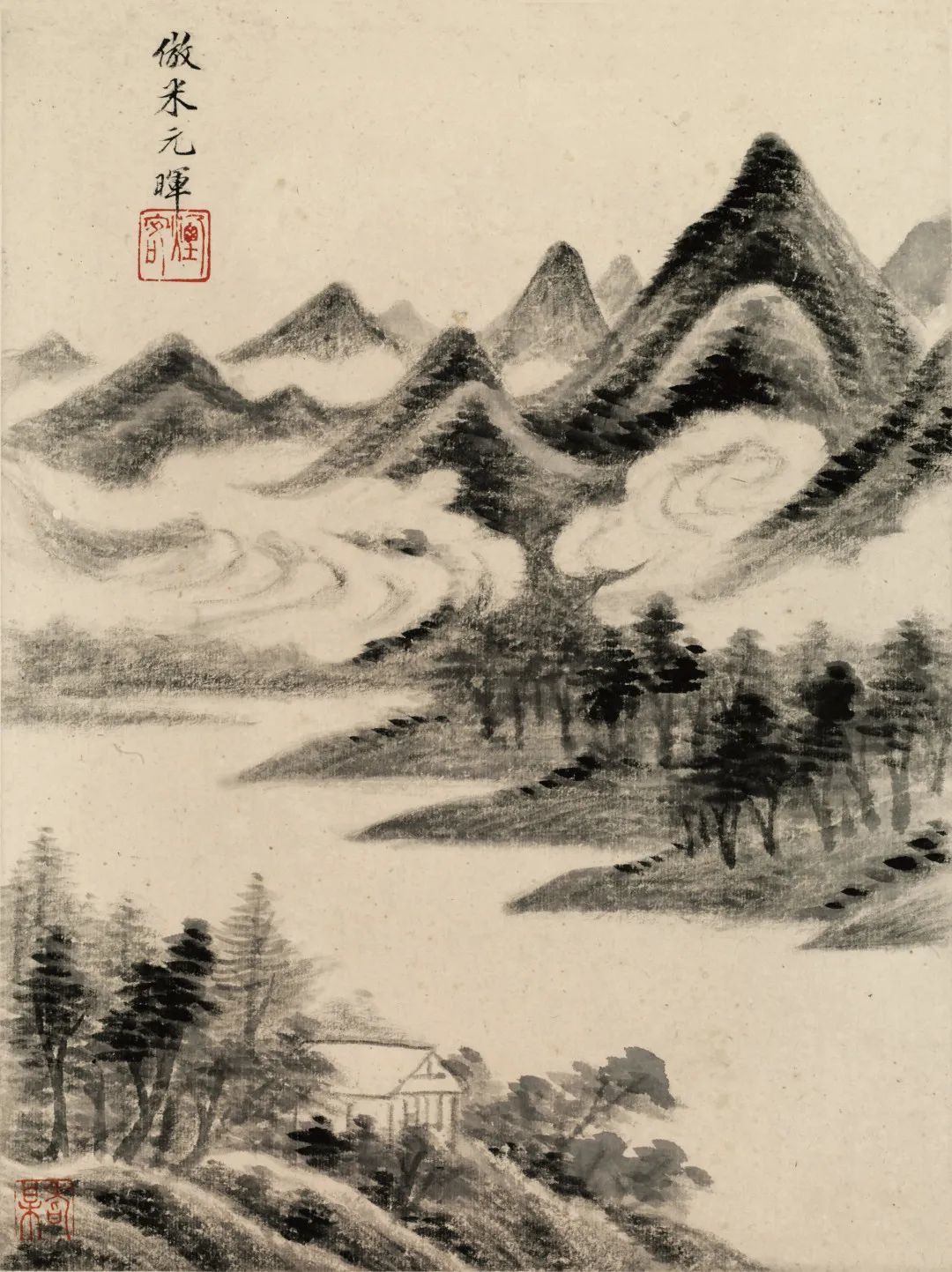 第一页,款署:“倣北苑”,钤白文印“逊之”。董源的山水平远幽深,率多真意。皴法状如麻皮,后人称为“披麻皴”。山头苔点细密,水色江天,云霭显晦,峰峦掩映,幽居村舍,渡头溪桥,一派江南之景致。宋代沈括称董源“多写江南真山,不为奇峭之笔”。元代黄公望说:“作山水者必以董为师法,如吟诗之学杜也”。清代王鉴说“画之有董巨,如书之有钟王,舍此则为外道”。由此可知,董源对后世山水画产生的深远影响。此图虽云“倣北苑”,却有自家风范,可谓用古人法,抒己之胸臆。写出了峰峦晦明、洲渚掩映、林麓深秀的江南景色。