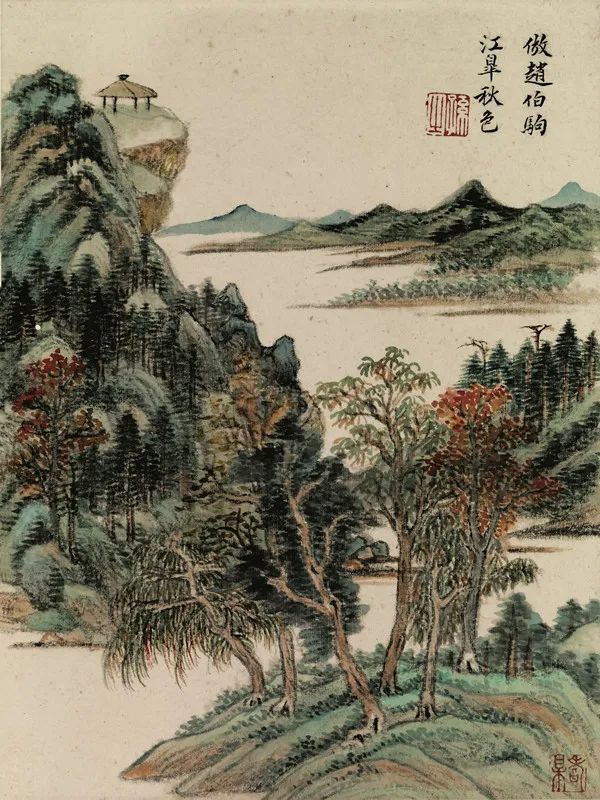 第二页,款题:“倣赵伯驹江皋秋色”,钤白文印“逊之”。赵伯驹山水以青绿见长,取法李思训父子,参古融今,布景繁密,勾勒精细,设色绚烂,典雅浓郁。此图虽云法赵伯驹,设色浓郁绚丽似之,勾勒皴法有自家法度,用墨厚重,墨色交融,更显设色明丽,去除了赵画萎靡柔媚之气,呈现一派秋天萧散高迈之气。