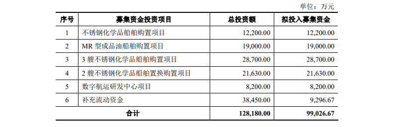 此次IPO兴通股份共募集资金10.76亿元,主要投向为:不锈钢化学品船舶购置项目12200万元,MR型成品油船舶购置项目19000万元,3艘不锈钢化学品船舶购置项目28700万元,2艘不锈钢化学品船舶置换购置项目21630万元,数字航运研发中心项目8200万元,扣除本次发行费用后剩余部份用于补充流动资金。